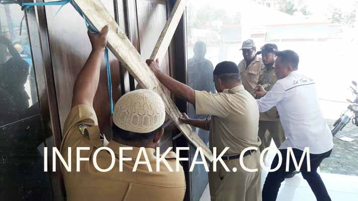 INFOFAKFAK.COM, FAKFAK_ Genap tujuh hari, akhirnya palang kayu yang menutup dua pintu utama gedung sidang paripurna DPRD Kabupaten Fakfak, Senin (6/8) siang tadi, dibuka. Palang kayu dibuka oleh Sekretaris DPRD Kabupaten Fakfak dan Kasat Intel Polres Fakfak, setelah sebelumnya Ketua Dewan Adat Mbaham Matta Kabupaten Fakfak, Sirzet Gwasgwas, datang dan mengijinkan pembukaan palang.